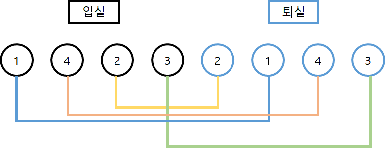 나는 그림을 그려서 문제의 규칙을 찾아보고자 했다. 먼저 입실을 1, 4, 2, 3 순으로 하고, 퇴실을 2, 1, 4, 3으로 하는 경우를 살펴보자.